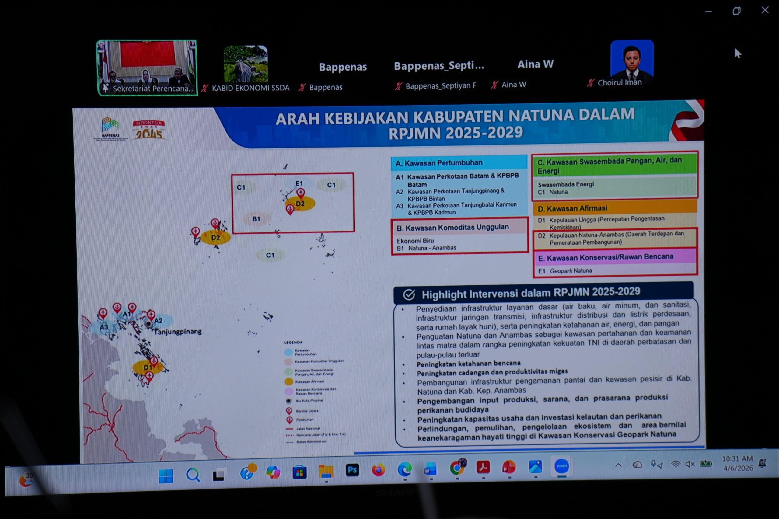 (wartaKominfo) — Kepala Bidang Pengelolaan Informasi dan Komunikasi Publik (PIKP) Dinas Komunikasi dan Informatika Kabupaten Natuna menghadiri rapat bersama Tim Kementerian PPN/Bappenas terkait Pengembangan Potensi Sumber Daya Alam (SDA) dan Evaluasi Geopark Natuna menuju UNESCO Global Geopark (UGGp), yang dilaksanakan di Ruang Rapat Lantai II Kantor Bupati Natuna, Bukit Arai, Senin (06/04/2026) pagi.