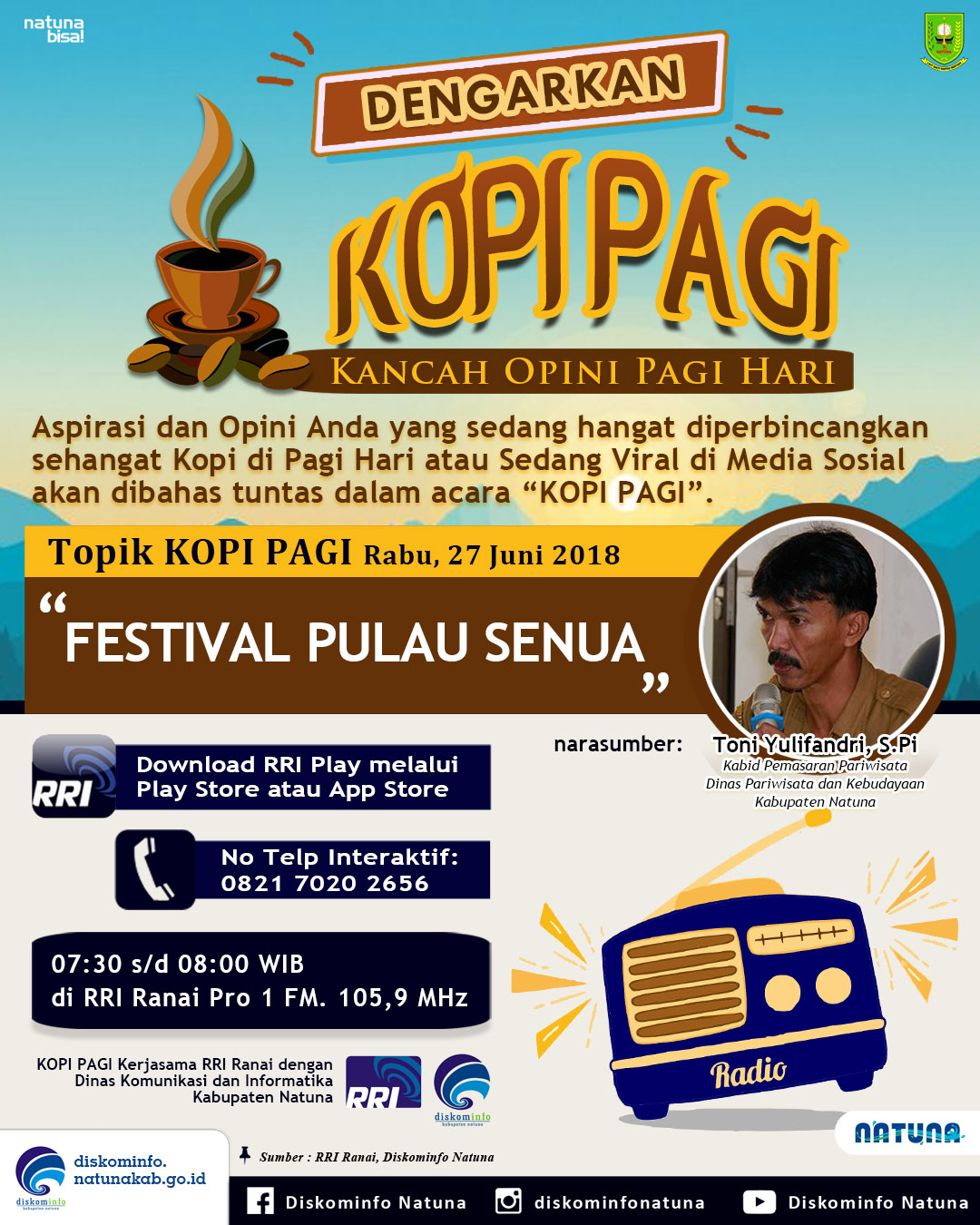KOPI PAGI – Festival Pulau Senua Post published:25/06/2018 Post category:PUBLIKASI Festival Pulau Senua Tags: diskominfo, diskominfonatuna, infografis, kominfo, kopipagi, natuna, oneirfaan, publikasi Read more articles Previous PostKadis Kominfo Natuna Ingatkan Pegawainya Pelajari UU ITE Next PostDPAD Natuna Ingin Luncurkan Aplikasi Perpustakaan dan Kearsipan Berbasis Teknologi Informasi You Might Also Like 5 Ton Kabel Optik Bawah Laut, Lesap Disamun 28/05/2018 KOPI PAGI Kartu Identitas Anak 20/03/2018 Undangan Tabligh Akbar bersama Ustad Abdul Somad 30/01/2018