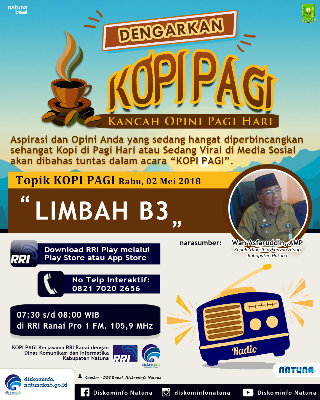 KOPI PAGI – Limbah B3 Post published:02/05/2018 Post category:PUBLIKASI Limbah B3 Tags: diskominfonatuna, infografis, kominfo, kopipagi, natuna, oneirfaan, publikasi Read more articles Previous PostRapat Koordinasi Survey Pemanfaatan Teknologi Informasi Dan Komunikasi Kabupaten Natuna Tahun 2018 Next PostListrik Midai Beroperasi 24 Jam You Might Also Like Tahun 2018 Kemenhub Mendapatkan Alokasi Anggaran Sebesar Rp. 48,187 Triliun 07/09/2017 KOPI PAGI – WiFi Gratis 28/08/2018 Layanan Disdukcapil Natuna 12/02/2018