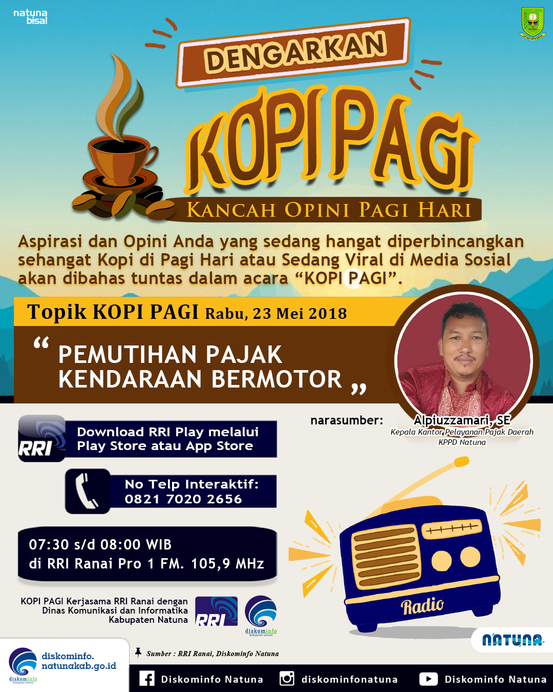 KOPI PAGI – Pemutihan Pajak Kendaraan Bermotor Post published:21/05/2018 Post category:PUBLIKASI Pemutihan Pajak Kendaraan Bermotor Tags: diskominfo, infografis, kominfo, kopipagi, natuna, oneirfaan, publikasi Read more articles Previous PostBerita Cepat Tanpa mengabaikan Keakuratan Next PostPenetapan Jam Kerja Pemkab Natuna Selama Ramadhan You Might Also Like Infrastruktur Telekomunikasi di Perbatasan Laut Natuna Utara Akan Meningkat, Masyarakat Harus Bijak Ber Medsos 07/04/2021 Selesai Dibangun 2018, Ini Dua Skema Tarif Palapa Ring 10/07/2018 Hari Kusta Internasional 25/01/2018