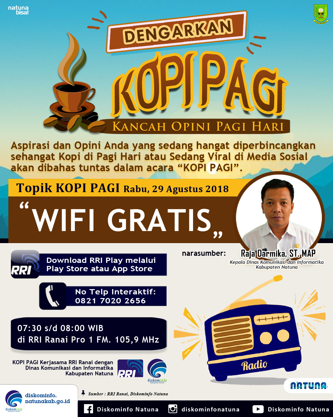 KOPI PAGI – WiFi Gratis Post published:28/08/2018 Post category:PUBLIKASI Kopi Pagi Wifi Gratis Tags: diskominfo, diskominfonatuna, infografis, kominfo, kopipagi, natuna, oneirfaan, publikasi Read more articles Previous PostUcapan Idul Adha 1439 H Kab. Natuna Next PostMedsos Dipantau usai Kepala BSSN Dilantik, Kominfo: Itu Hoax You Might Also Like Menkominfo: Digitalisasi SPBE Tingkatkan Akuntabilitas Pemerintahan 11/11/2021 KOPI PAGI – Karya Tanpa Batas Seniman Natuna 16/04/2018 KOPI PAGI – Pembentukan Kelurahan Batu Hitam 07/05/2018