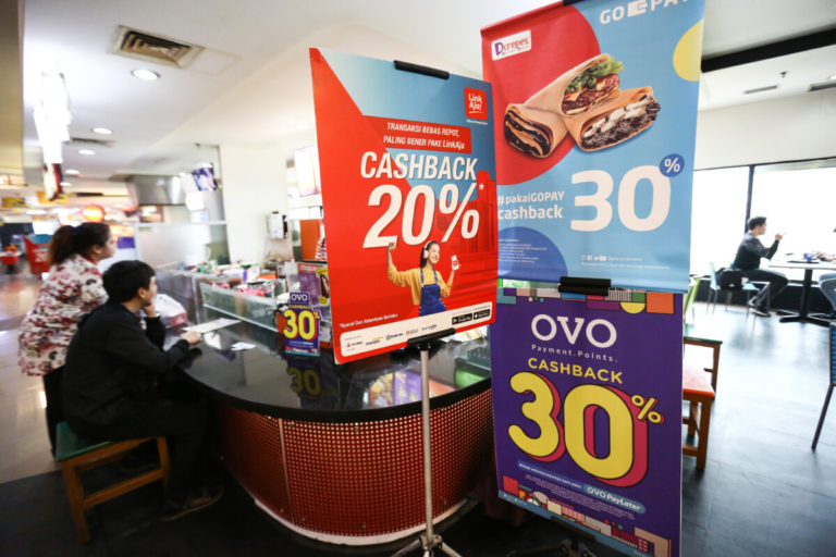 Tanda menerima pembayaran dari sejumlah uang elektronik menghiasi gerai minuman di pusat perbelanjaan di kawasan Kuningan, Jakarta Selatan, Sabtu (22/6/2019). Kepraktisan dan iming-iming imbal tunai serta semakin banyak usaha yang memanfaatkan pembayaran dari uang elektronik ini menjadikan penggunaannya semakin luas.