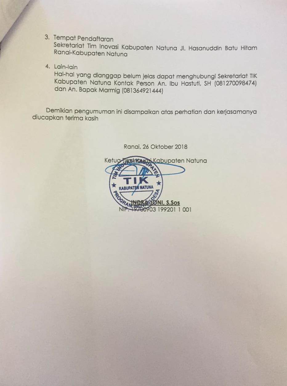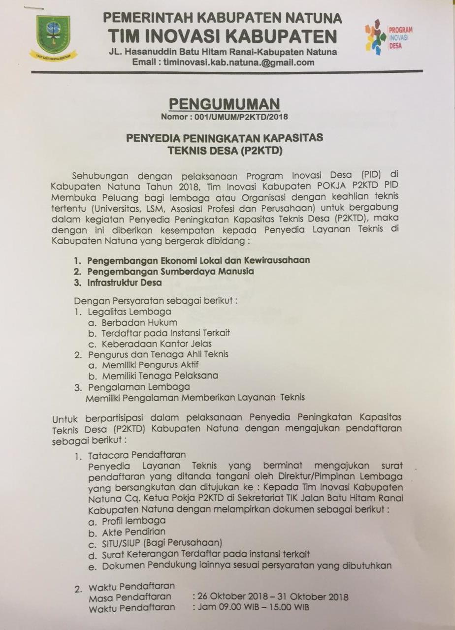 Pengumuman Penyedia Peningkatan Kapasitas Teknis Desa (P2KTD) Post published:29/10/2018 Post category:PENGUMUMAN Tags: arsha, pengumuman Read more articles Previous PostPeran Keluarga Dalam Peningkatan Mutu Pendidikan di Natuna Next PostMedia Massa dan Kepribadian Part I You Might Also Like Tips Cerdas Mewaspadai HOAX 28/02/2017 Seleksi Media Publikasi Data Dan Statistik Daerah Kabupaten Natuna 2017 24/10/2017 Program Beasiswa S2 Kominfo 2017 28/02/2017