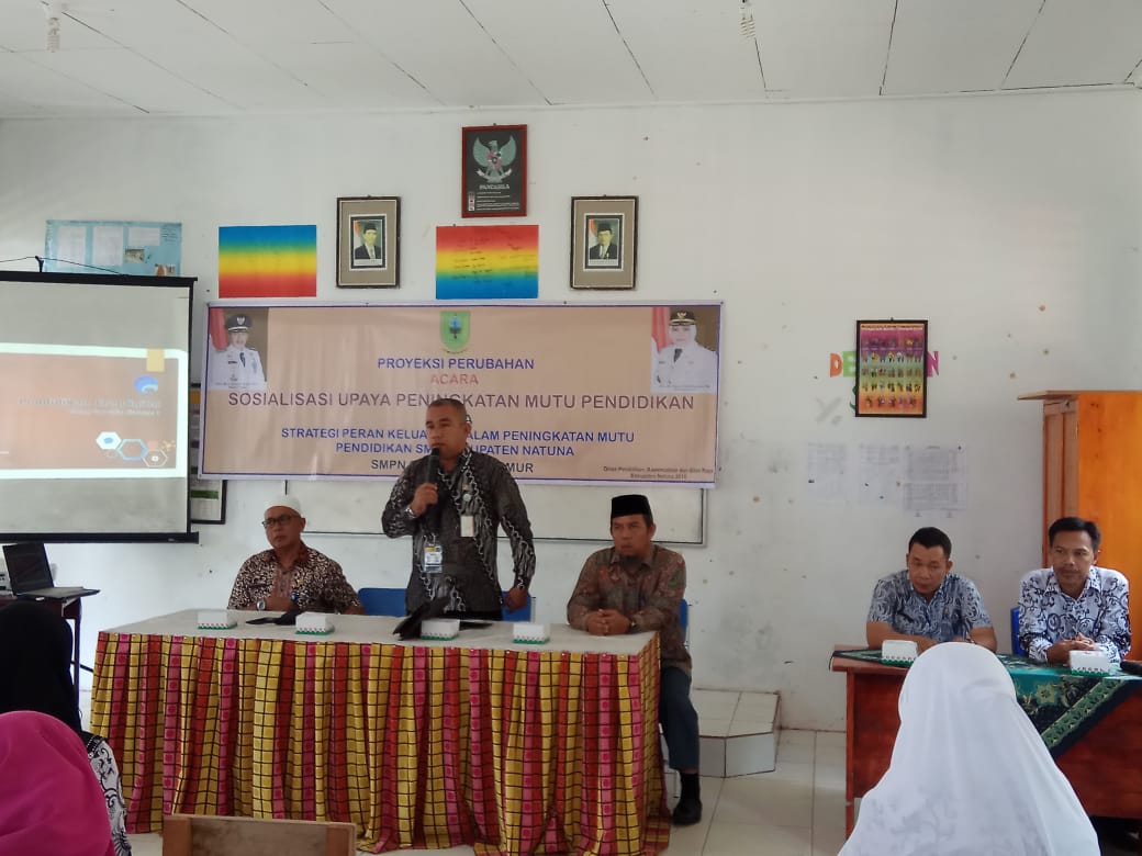 (WartaKominfo) – Guna Meningkatkan mutu pendidikan di Kabupaten Natuna, Dinas Pendidikan, Pemuda dan Olahraga Kabupaten Natuna menggelar Sosialisasi Upaya Peningkatan Mutu Pendidikan yang bertemakan Strategi Peran Keluarga dalam Peningkatan Mutu Pendidikan tingkat SMP Kabupaten Natuna di SMPN 02 Bunguran Timur, Kamis (25/10).
