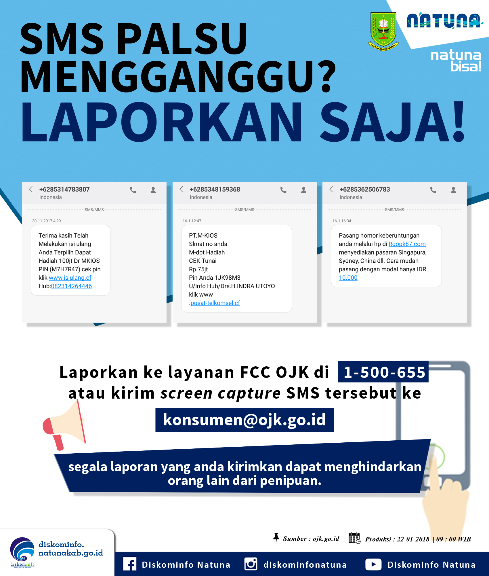 SMS Palsu Mengganggu? Laporkan Saja! Post published:23/01/2018 Post category:PUBLIKASI Tags: arsha, diskominfo, infografis, kominfo, publikasi Read more articles Previous PostKekah Natuna presbytis natunae Next PostPengumuman Registrasi terkendala NIK dan KK You Might Also Like Rudiantara: Striker Kemkominfo Adalah Ditjen IKP dan Ditjen Aptika 14/09/2017 KOPI PAGI – Bukit Raya Ku Tergadai di Karang Neneh 28/05/2018 Penetapan Jam Kerja Pemkab Natuna Selama Ramadhan 21/05/2018